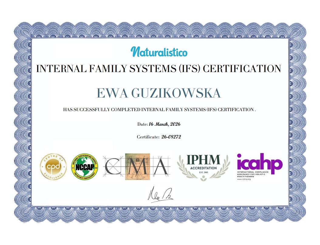 Ukończyłam szkolenie w metodzie Internal Family Systems (IFS) i posiadam certyfikat facylitatorki tej metody.